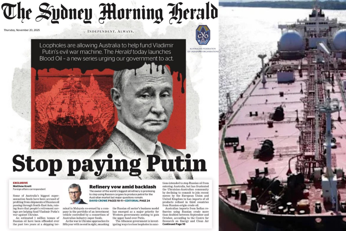 Corrigan has spent the last few years researching, writing and standing alongside Australian Ukrainians to highlight the shocking injustice of how Russian oil is essentially laundered through other countries' refineries, then welcomed into Australia and sold at petrol bowsers - making us all unwitting supporters of Russia's invasion of Ukraine.